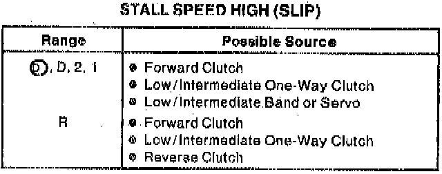 If the stall speeds were too high, refer to the Stall Speed Chart (shown). If the stall speeds were too low, first check engine tune-up. If engine is OK, remove torque converter and check torque converter clutch for slippage.