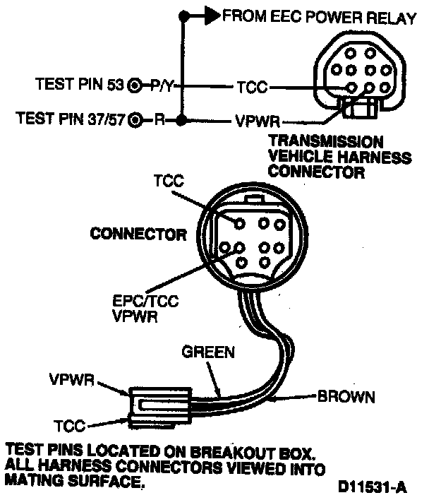 This view will be helpful for Pinpoint Test C as it identifies the Torque Converter Clutch (TCC) Solenoid connections on the harness.