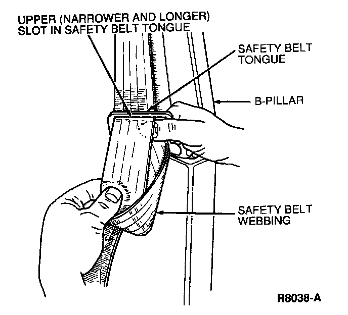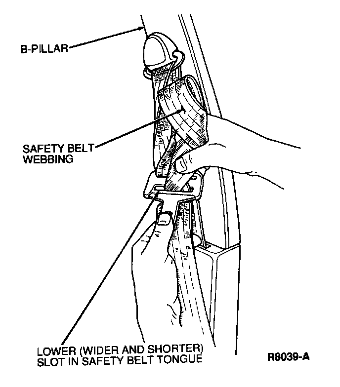 1. Grasp belt tongue and pull down on belt webbing to form a loop through the upper (narrow and longer) slot in the tongue.