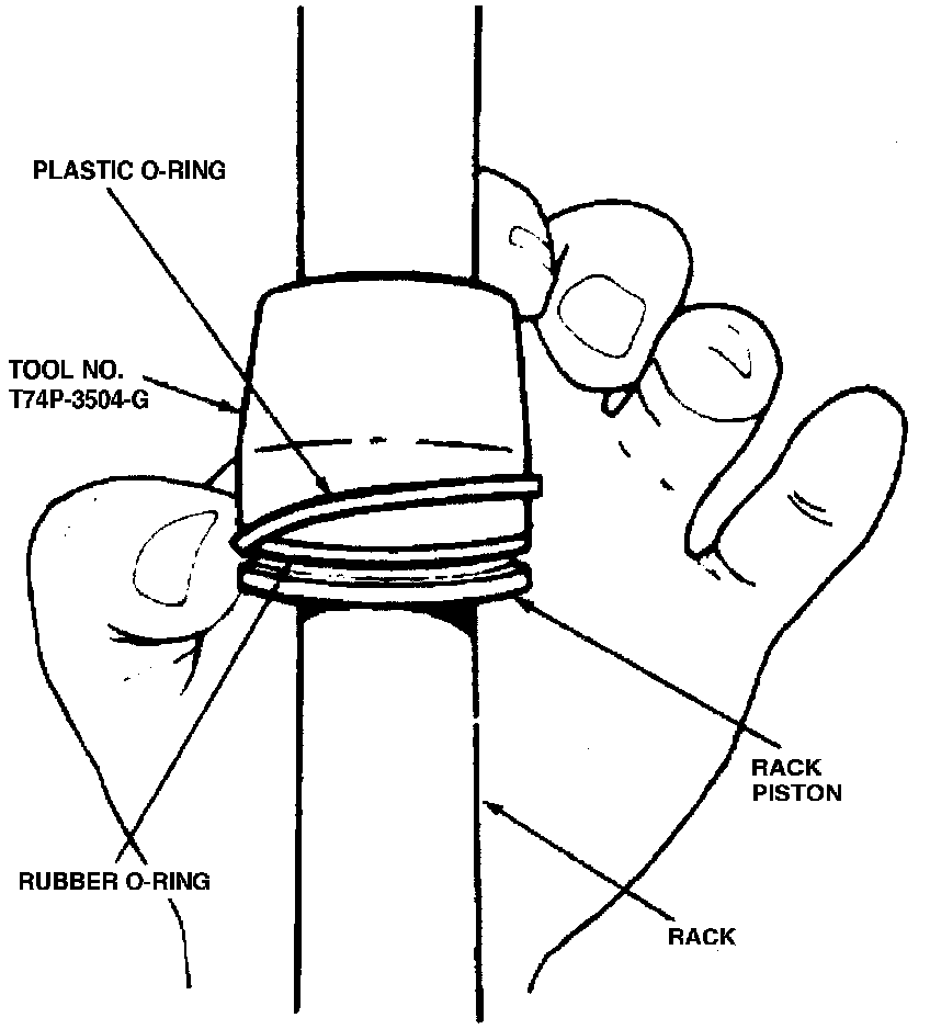 4. Position plastic O-ring on Teflon(R) ring replacer T74P-3504-G, or equivalent, then slide tool and O-ring onto rack until they are adjacent to the rack piston. Slide plastic O-ring off tool and into piston groove over rubber O-ring.