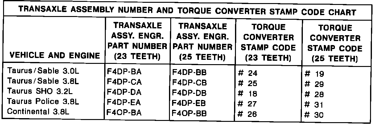 1. Refer to the Transaxle Assembly And Torque Converter Stamp Code Chart to ensure correct parts usage. To identify this change, the converter stamped code and the transaxle assembly number have been changed.