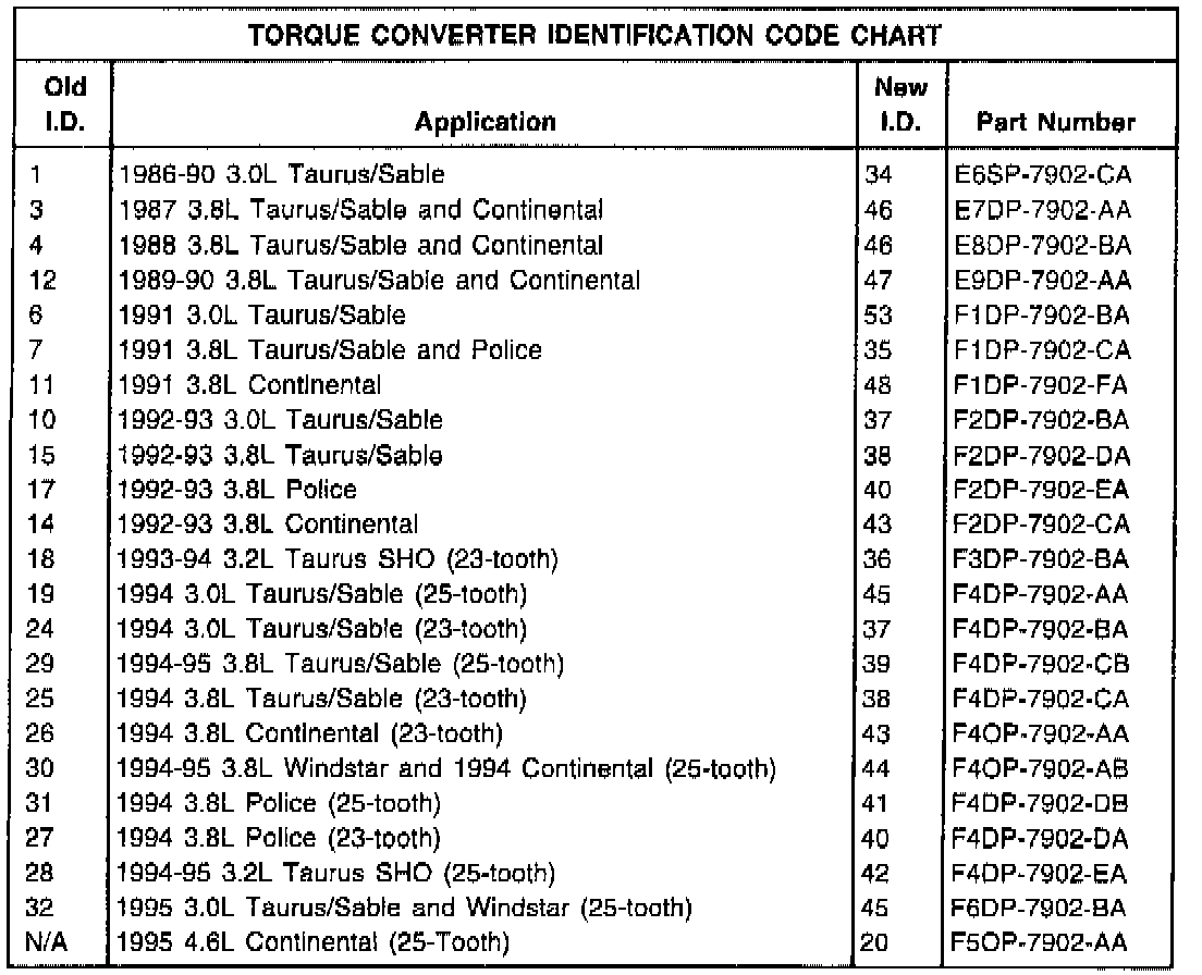 Refer to the Torque Converter identification Code Chart for torque converter identification.