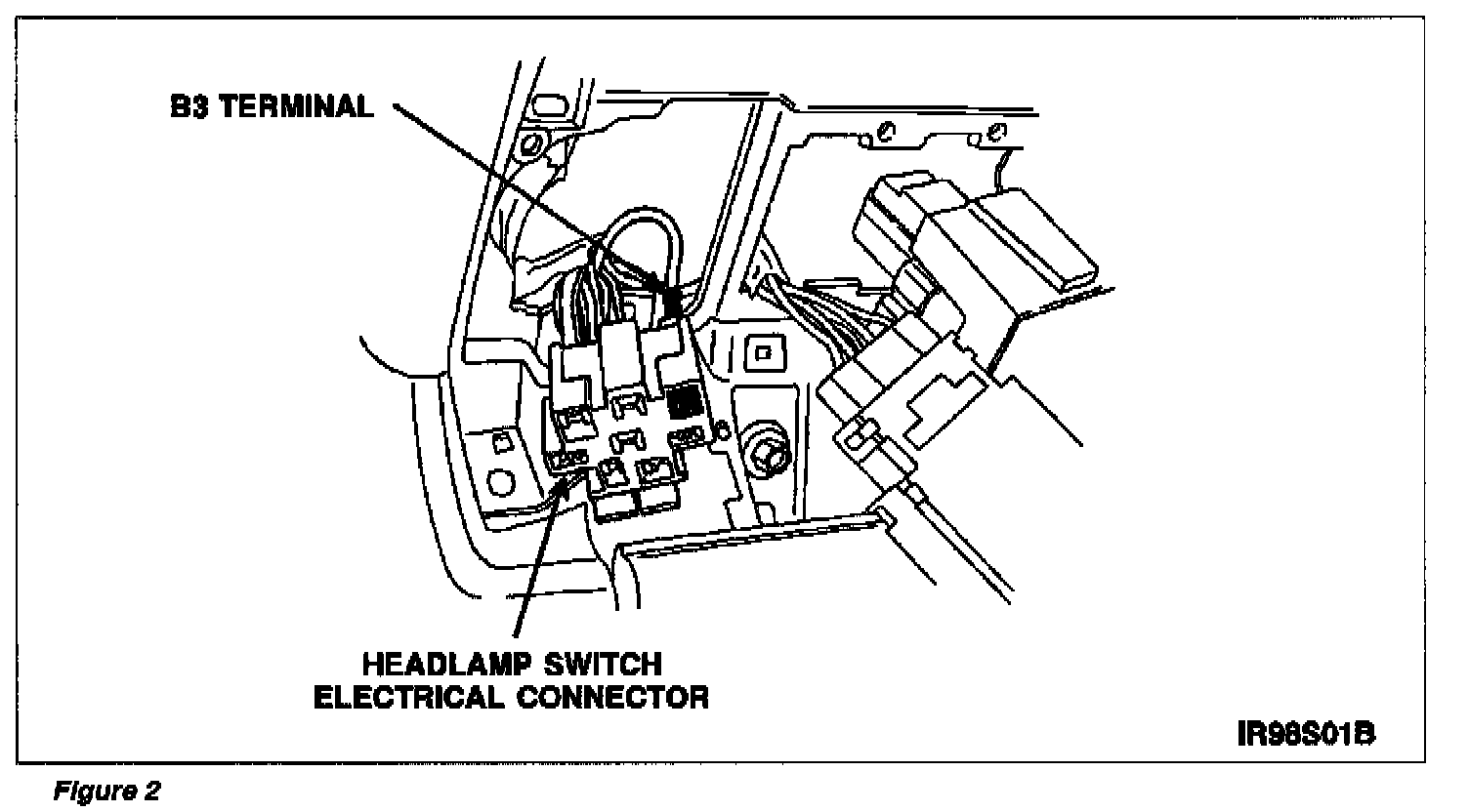 9. Remove terminal B3 from the headlamp switch electrical connector.See Figure 2. Cut terminal end off wire 13 mm (1/2 inch) from connector.Splice on new wire with correct terminal end obtained from switch + B3 kit, F8OZ-1 1654-BA. Install terminal into B3 terminal slot of connector.