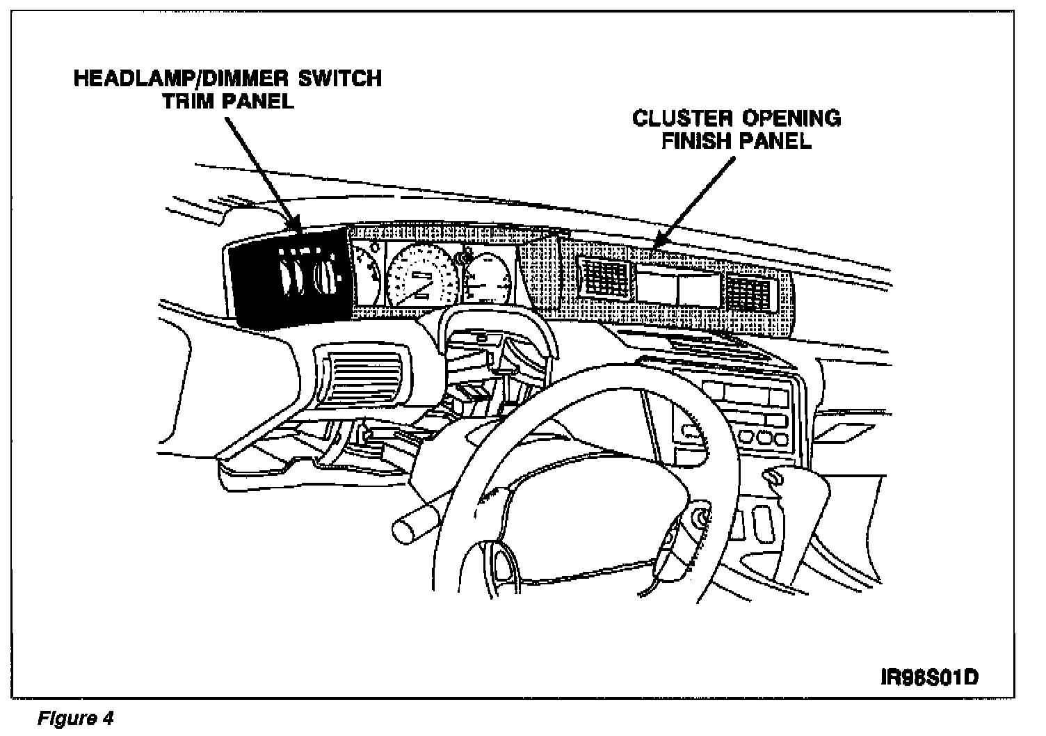 7. Detach headlamp/dimmer switch trim panel by pulling at the LH end to unsnap it from the instrument cluster finish panel. See Figure 4.