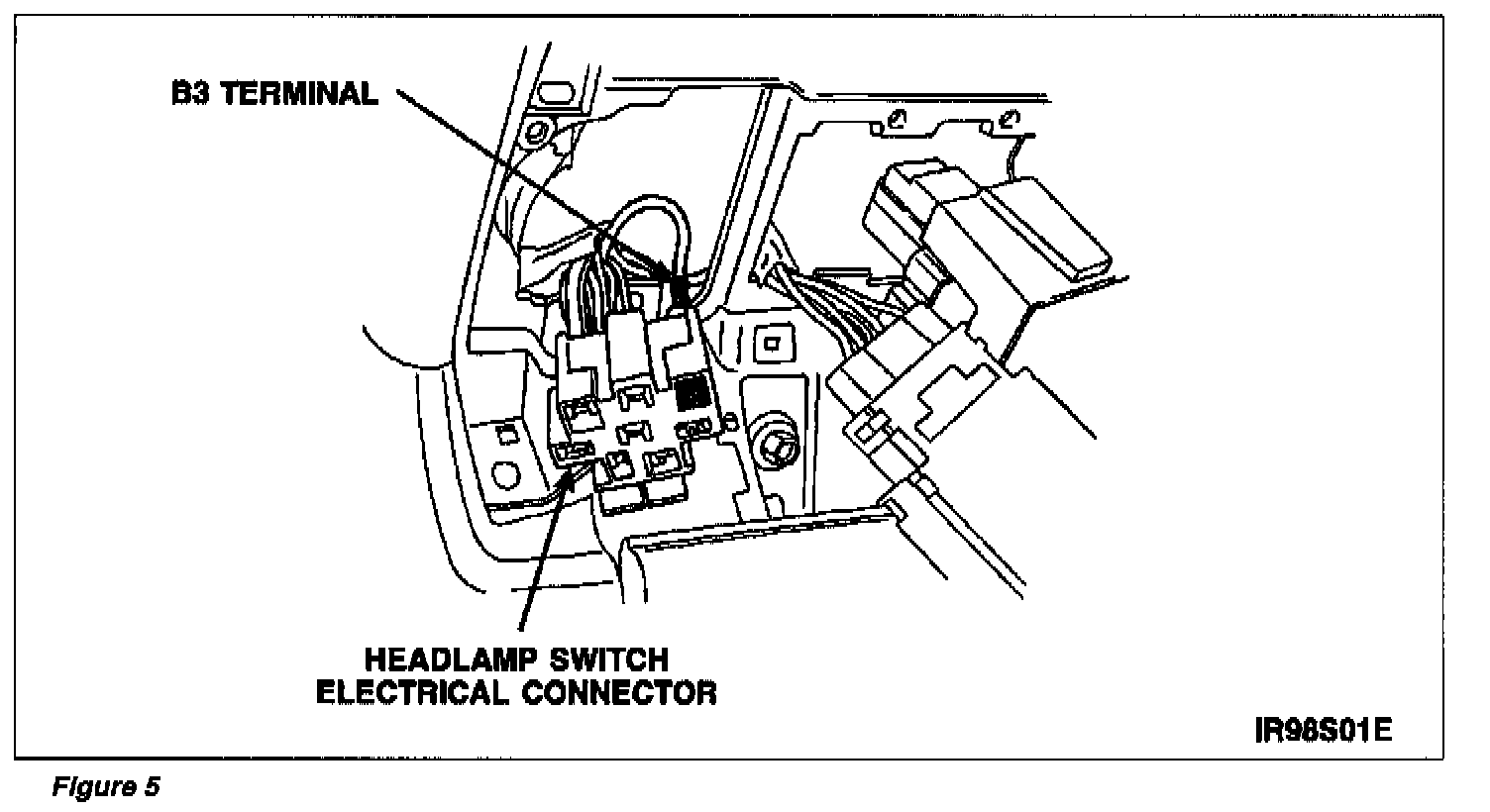 12. Remove terminal B3 from the headlamp switch electrical connector. See Figure 5. Cut terminal end off wire 13 mm (1/2 inch) from connector.Splice on new wire with correct terminal end obtained from switch + B3 kit, F8LZ-11654-CA. Install terminal into B3 terminal slot of connector.
