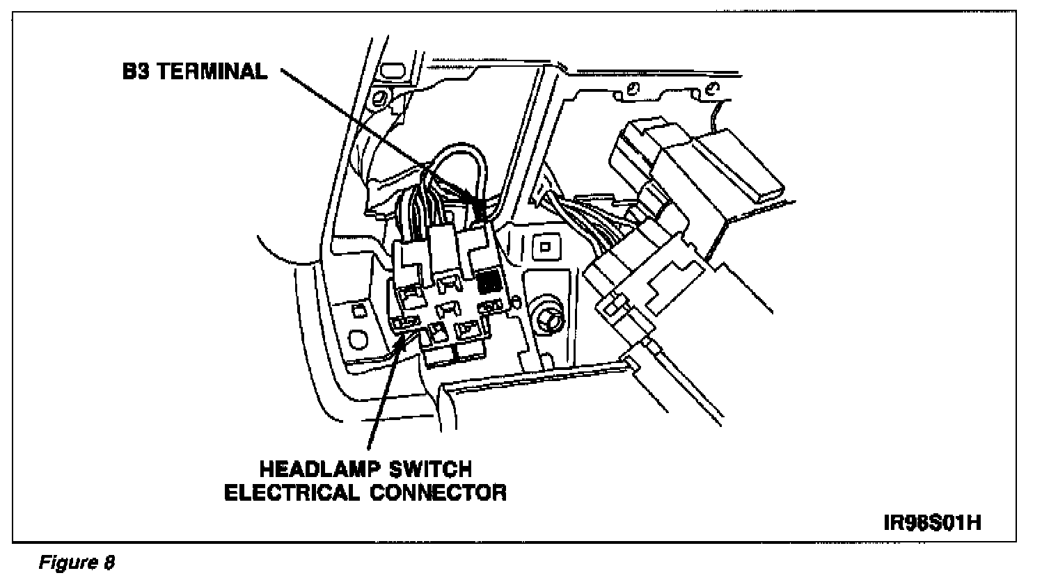 10. On vehicle equipped with auto lamp option, remove terminal B3 from the headlamp switch electrical connector. See Figure 8. Cut terminal end off wire 13 mm (1/2 inch) from connector. Splice on new wire with correct terminal end obtained from switch + B3 kit, F8DZ-11654-FA. Install terminal into B3 terminal slot of connector.