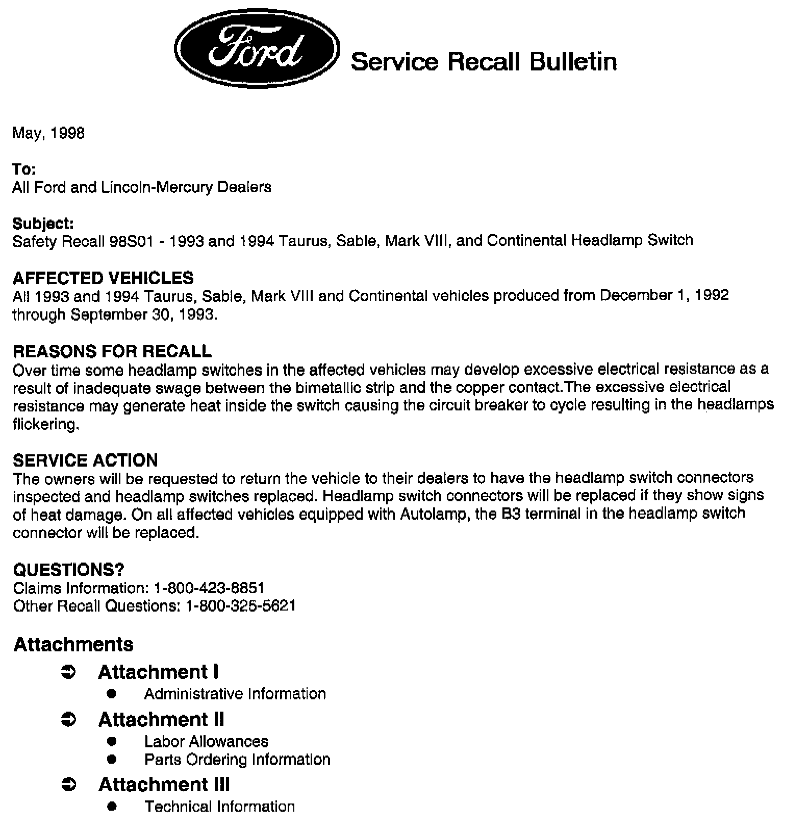Recall - Headlamp Switch