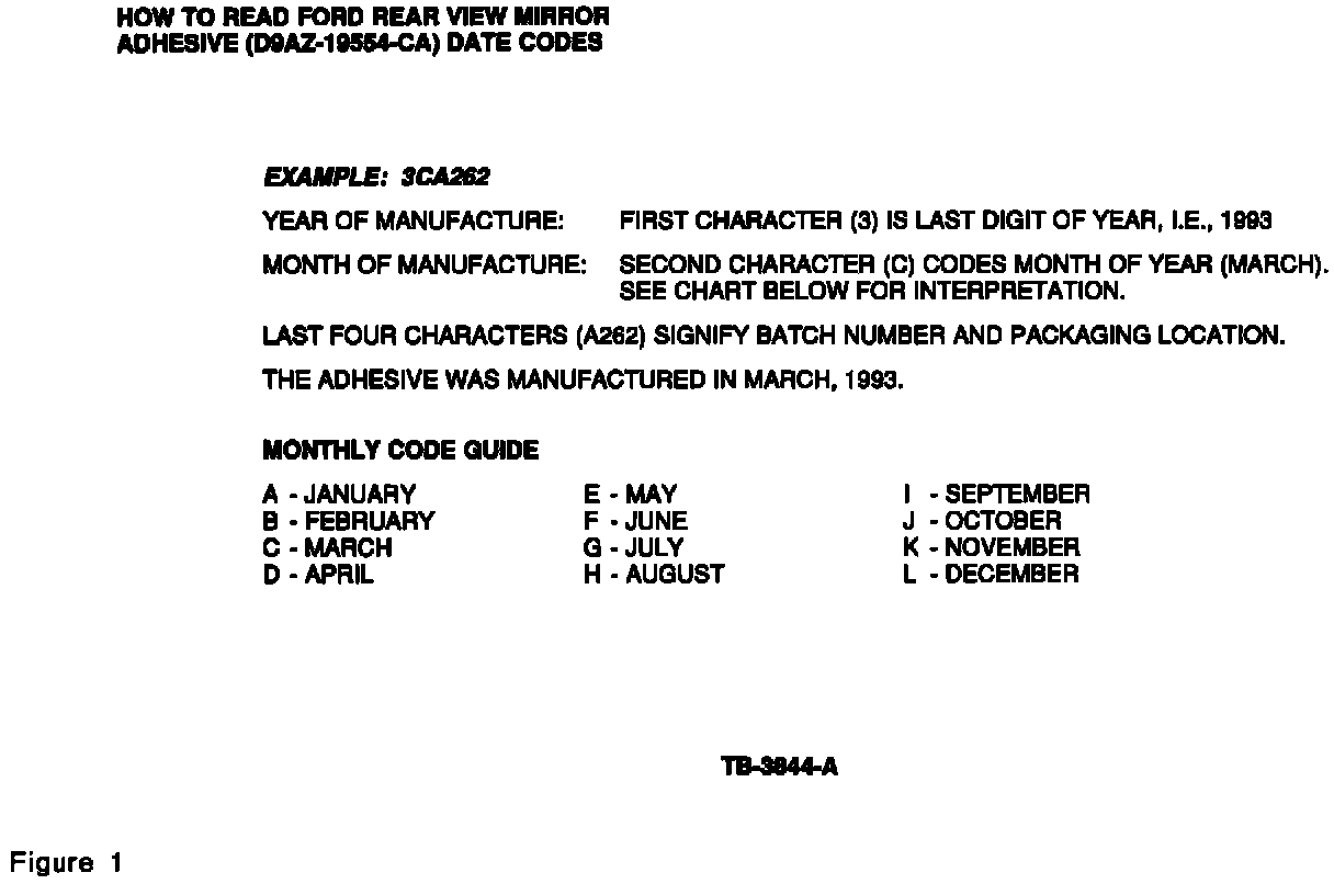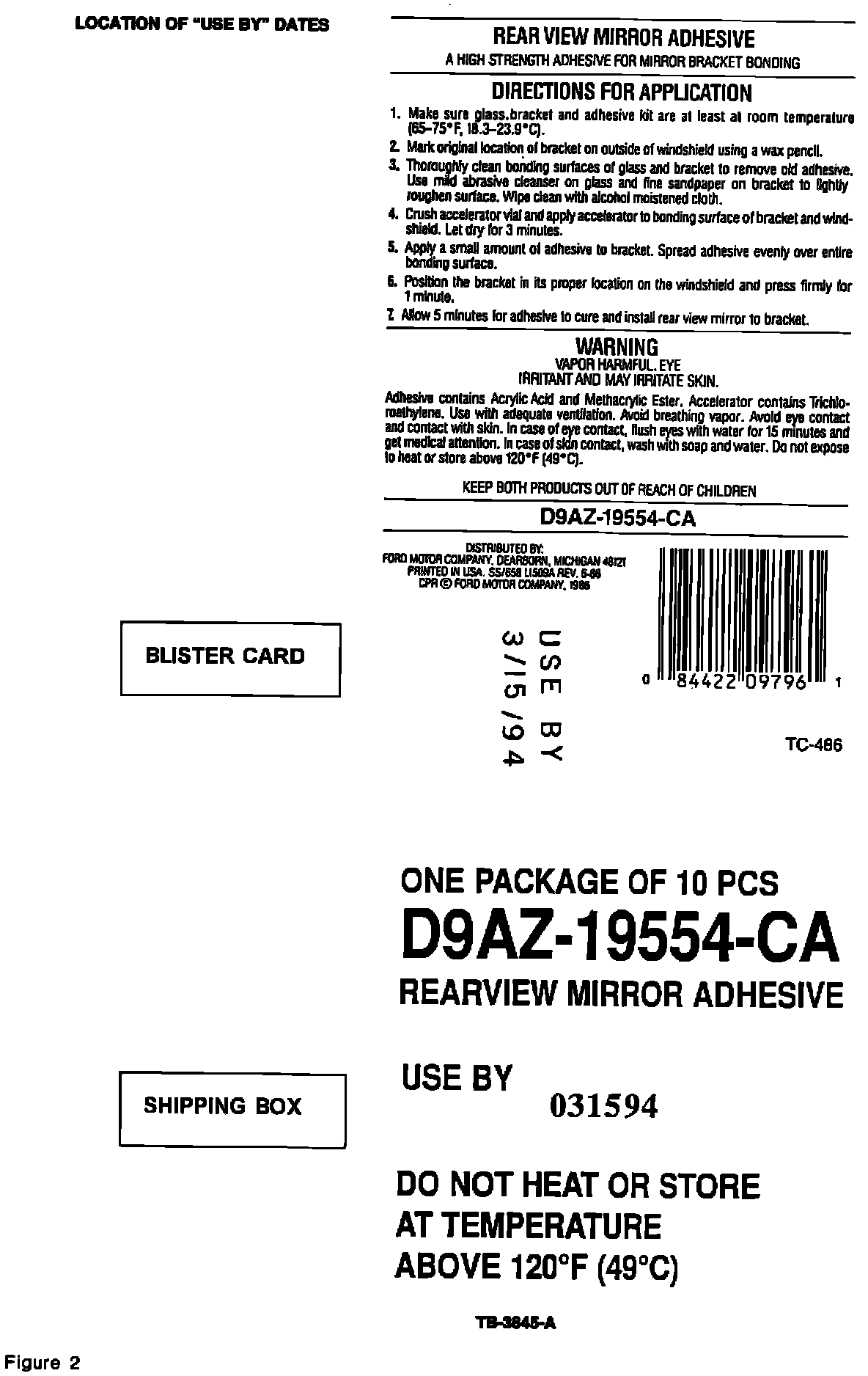 This date represents the date the material was manufactured. Ford recommends that material older than one year old not be used to install interior rear view mirror assemblies. To enable dealership personnel to more easily determine the suitability of the material, the individual kits and the shipping box will be stamped with a "Use By" date. The new "Use By" label will be on all products made after June, 1994. Figure 2 shows the location of the "Use By" date on the back of each individual blister card and the shipping box.