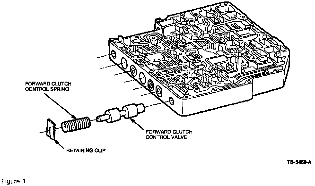 1. Inspect for a broken retaining clip by removing the valve body and then the valve body separator plate. Inspect the forward clutch control valve, spring, retaining clip, and valve body casting for damage (Figure 1).