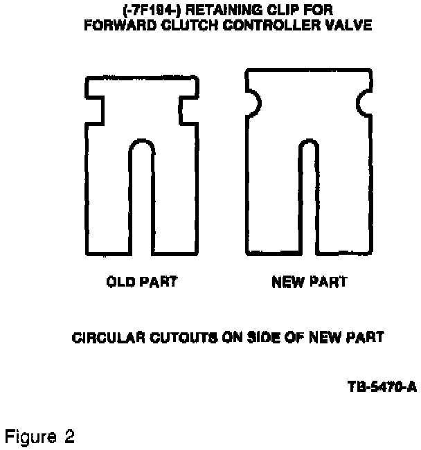 2. If the clip is broken and the forward clutch control valve and/or valve body casting is damaged, replace the main control. The retaining clip has just been revised to prevent the chance of breakage. The revised Retaining Clip (F8DZ-7F194-AA) has circular cutouts on the side of the clip in place of the square cutouts on the previous design level clip (Figure 2).