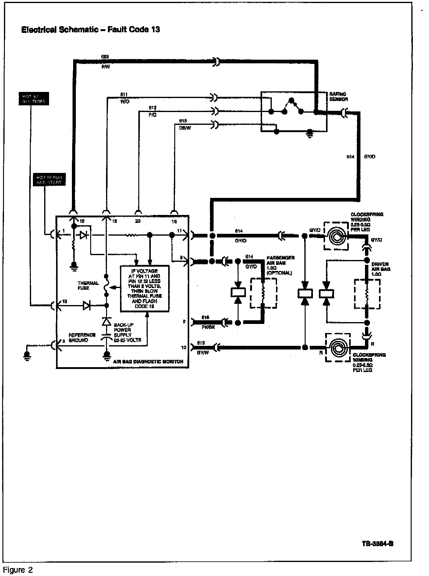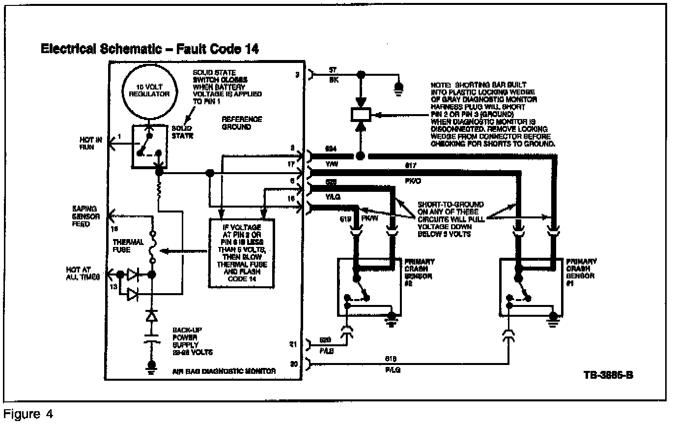 1. A short-to-ground occurs on one or more of the air bag deployment circuits.2. The diagnostic monitor recognizes the shorted wiring and, depending on which circuit the short occurred, flashes either a Code 13 (air bag circuit shorted) or Code 14 (primary crash circuit shorted). Refer to Figures 1 and 2 for Code 13 and Figures 3 and 4 for Code 14.