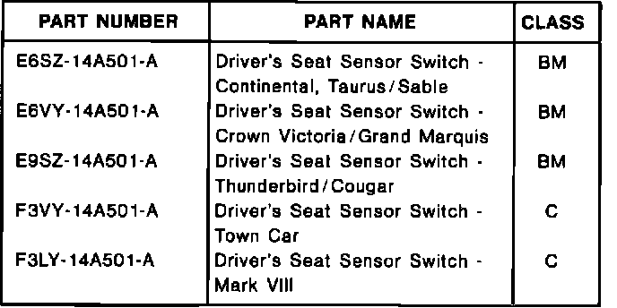 Install a new revised driver's seat sensor switch. Refer to the appropriate 1993/94 Service Manual, Section 01-10, for service details.