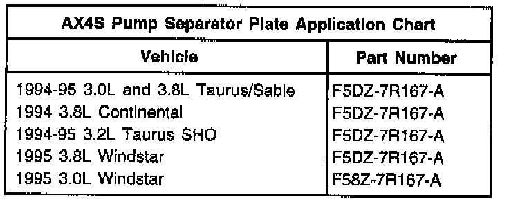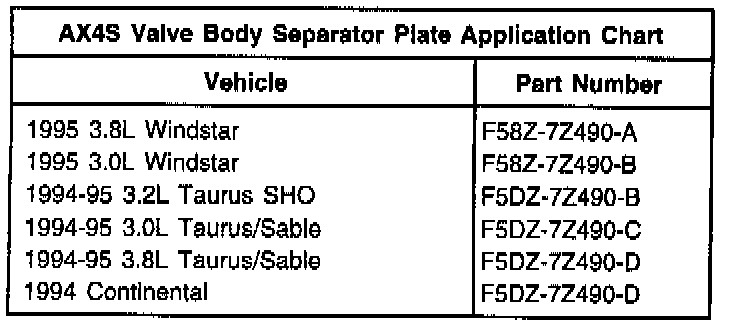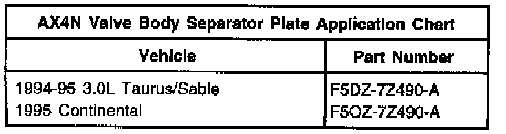Beginning April 19, 1994, the AX4S and AX4N transaxles contain bonded main control separator plate gaskets. For AX4S applications, both the valve body and pump body contain separator plates bonded with gaskets. For AX4N applications, only the valve body contains a separator plate with a bonded gasket.