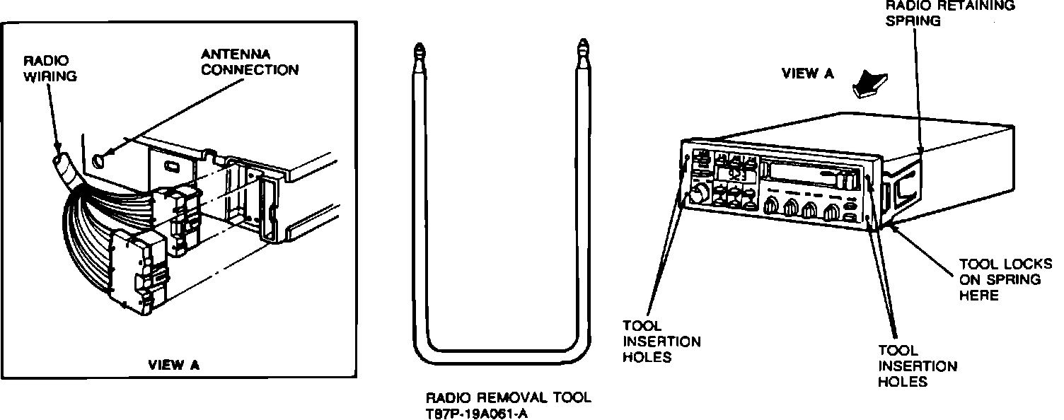 1. Insert Radio Removal Tool T87P-19601-A or equivalent into radio face plate. Press in 25.4mm (1 in) to release radio retaining clips. Pull radio from the instrument panel using the tool as handles.