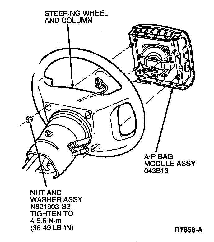 2. Position air bag module to steering wheel and secure with four nut and washer assemblies. Tighten to 4-5.6 Nm (35-50 lb-in).