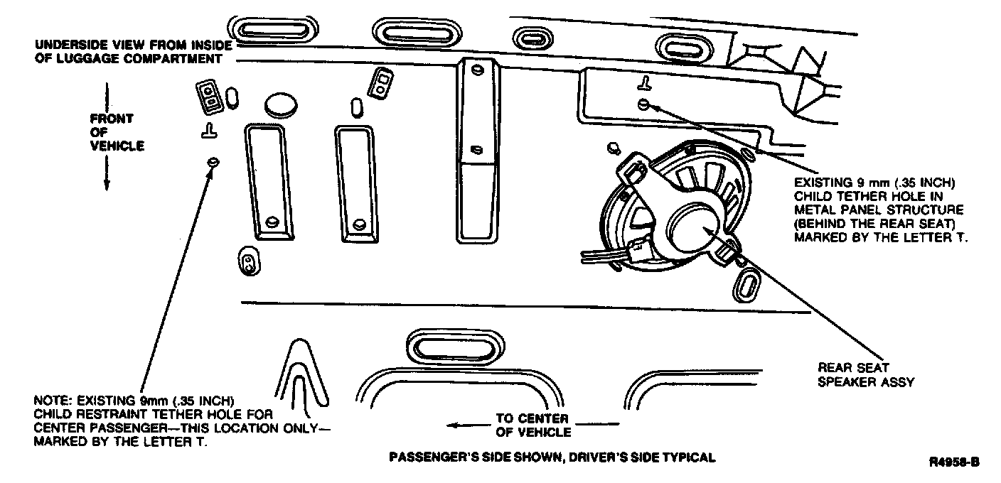 Look inside the luggage compartment, locate the 9 mm-diameter (0.35 inch)holes (behind the rear seat) in the metal panel structure marked by the embossed letter "T". The holes for the outboard seating positions are approximately 298 mm (11.75 inches) from the centerline of the vehicle and along a line 152 mm (6-inches) rearward from the center of the speaker grille openings. The hole for the center seat is about 86 mm (3.37 inches) to the left of the centerline and 38 mm (1.5 inches) rearward from the center of the speaker grilles.