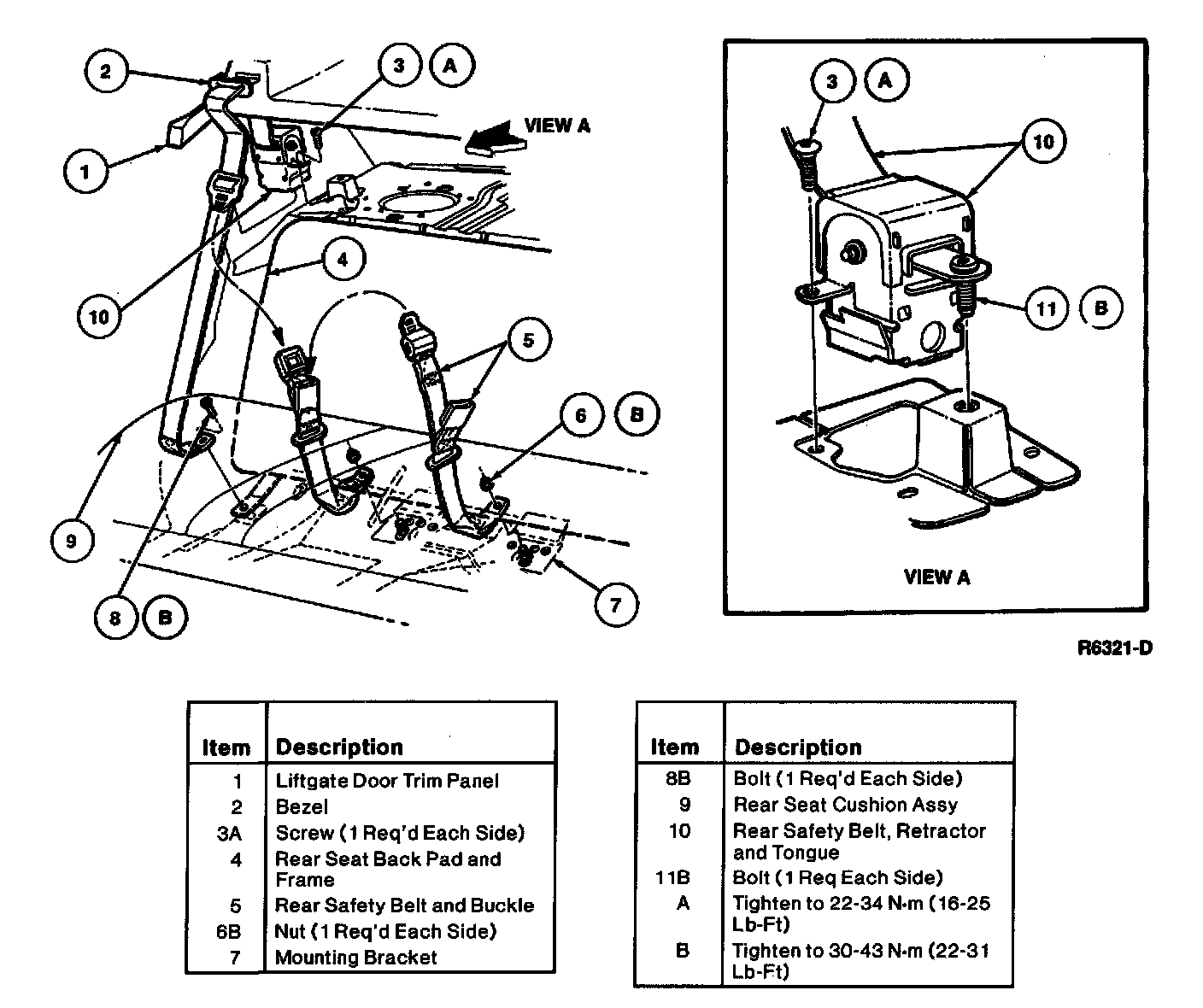 1. Disengage lower portion of rear seat cushion from retainer by pushing rearward. Remove safety belt retaining bolts.