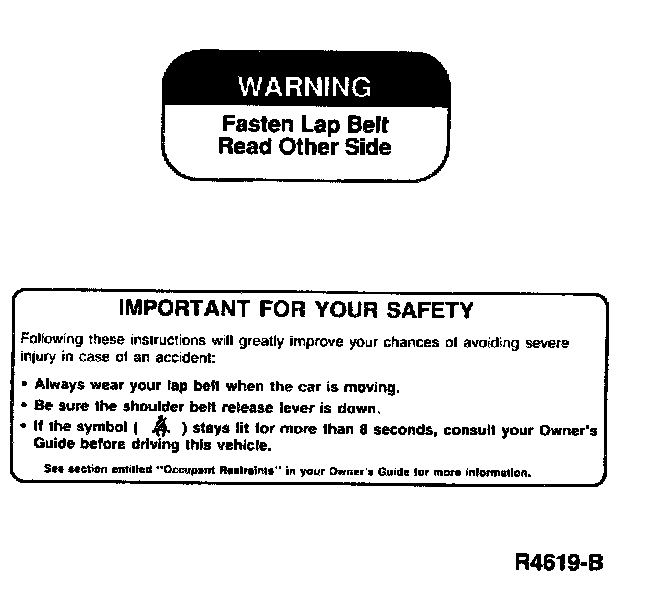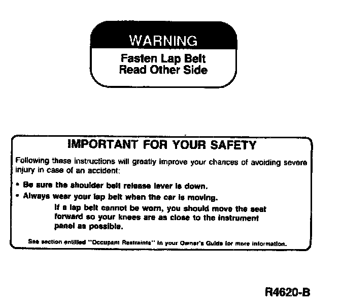 WARNING:- CHILDREN HAVING A SEATING HEIGHT GREATER THAN 71 CM (28 INCHES) SHOULD USE THE SAFETY BELTS PROVIDED WITH THE VEHICLE. HOWEVER, THE SHOULDER BELT PORTION OF THE LAP SHOULDER SAFETY BELT SHOULD NOT BE USED IF IT CONTACTS THE CHILD'S FACE, CHIN, NECK OR THROAT. FOR CHILDREN WHO ARE TOO LARGE FOR CHILD SAFETY SEATS (SEE INSTRUCTIONS WITH YOUR CHILD SEAT TO DETERMINE MAXIMUM RECOMMENDED SIZE), THE LAP BELTS IN THE CENTER REAR OR CENTER FRONT SEATS CAN BE USED. LAP-SHOULDER BELTS IN OTHER SEATS MAY BE USED IF THE LAP BELT PORTION FITS SNUGLY AND LOW ON THE HIPS AND THE SHOULDER BELT DOES NOT TOUCH OR REST IN FRONT OF THE FACE, CHIN, NECK OR THROAT. IF THE SAFETY BELTS ARE NOT ADJUSTED PROPERLY, THE CHILD'S CHANCES OF BEING INJURED IN A COLLISION INCREASE.