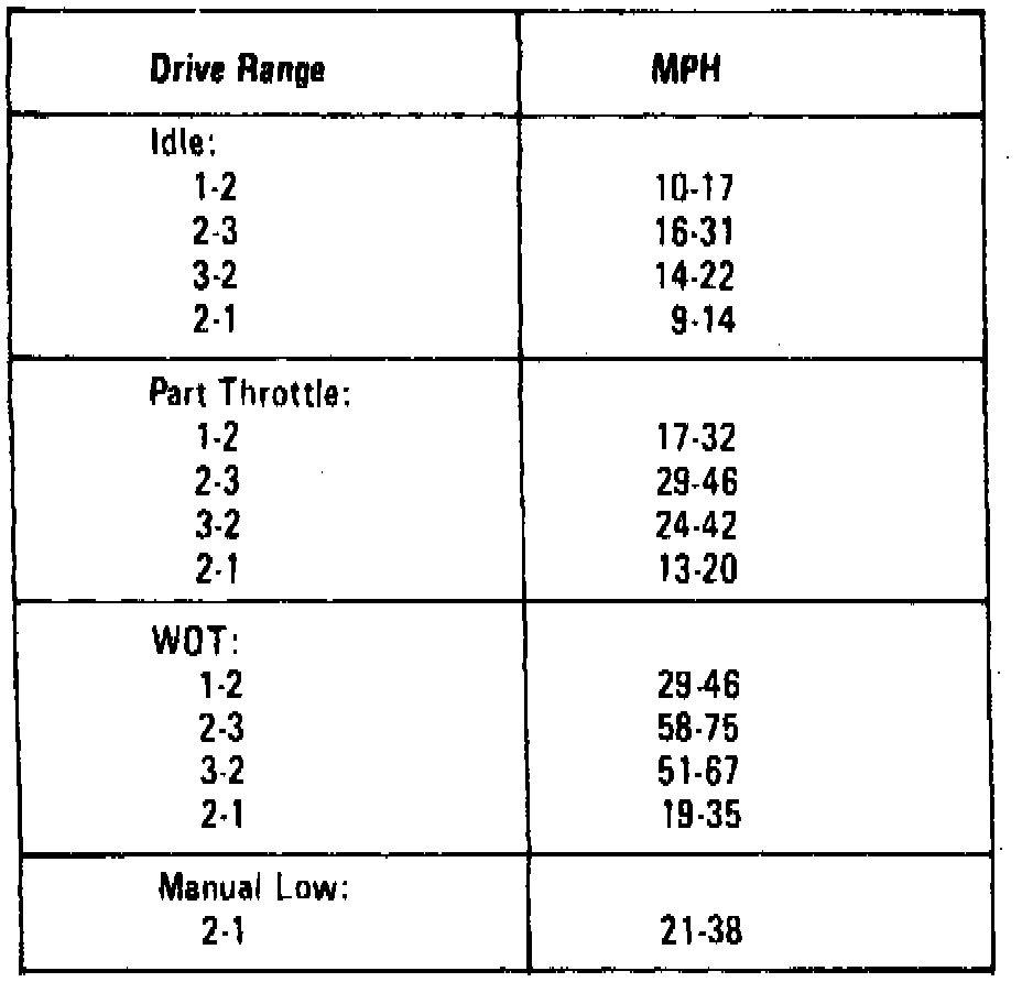2. Closed throttle downshifts from third to first are checked by coasting down from 30 MPH in third gear. Downshifts should occur within the limits indicated in the Shift Points Chart.