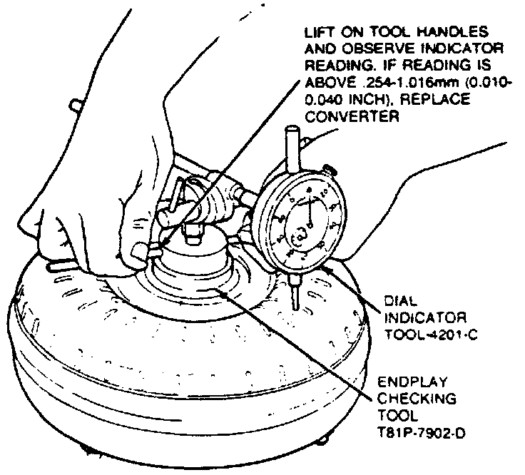2. Mount dial indicator on endplay checking tool. With stylus contacting converter shell and indicator zeroed, lift on checking tool handles.