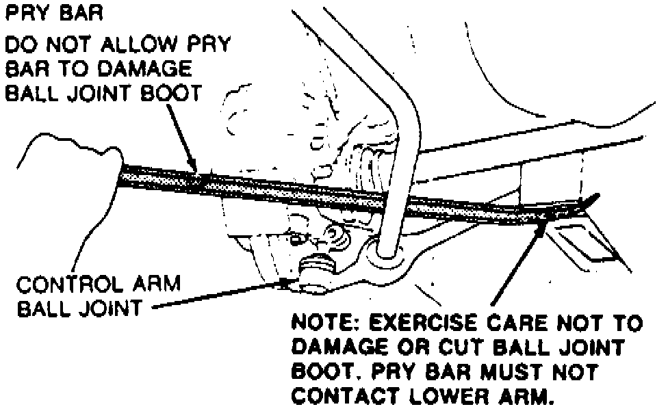 6. Separate ball joint from steering knuckle using pry bar. Lower ball joints fit into a pocket formed in the plastic disc brake shield. The shield must be positioned away from the ball joint while removing ball joint from steering knuckle.