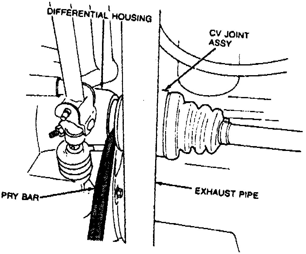 7. Remove driveshaft from differential housing using a pry bar. Use caution not to damage dust deflector located between shaft and case. If an automatic transaxle driveshaft assembly cannot be removed from differential by using a pry bar, insert a large bladed screwdriver between differential pinion shaft and inboard CV joint stub shaft. Sharply tap on screwdriver handle to free driveshaft from differential. Use caution not to damage differential oil seal, joint boot or dust deflector.