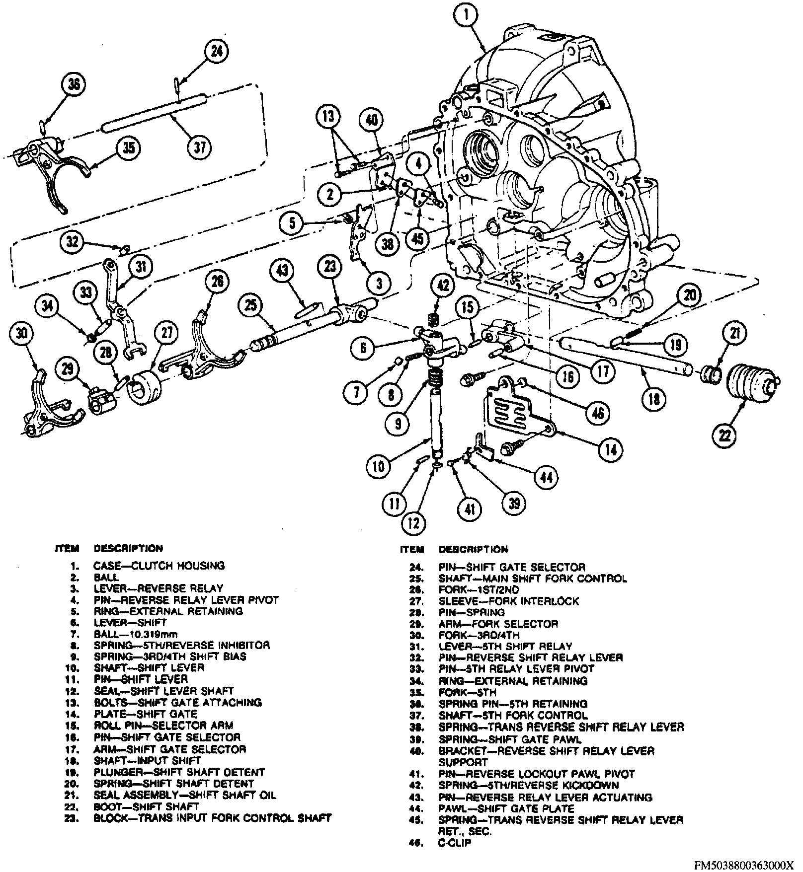 e. With oil relief flat first, depress reverse inhibitor plunger through case pedestal using drift. Ensure shaft has enough clearance so it will not interfere with shift lever shaft.