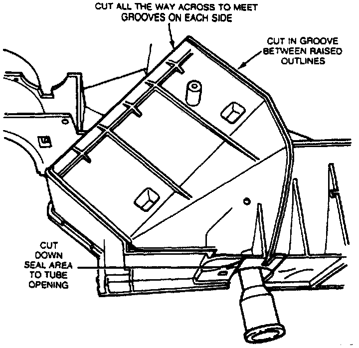 16. Using a small saw blade, cut the top of evaporator case between two raised outlines, Figs. 12 and 13.