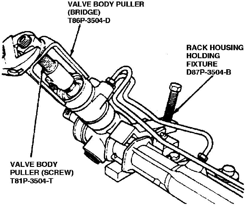 9. Attach valve body puller T86P-3504-D and valve body puller T81P-3504-T, or equivalent, to input shaft.