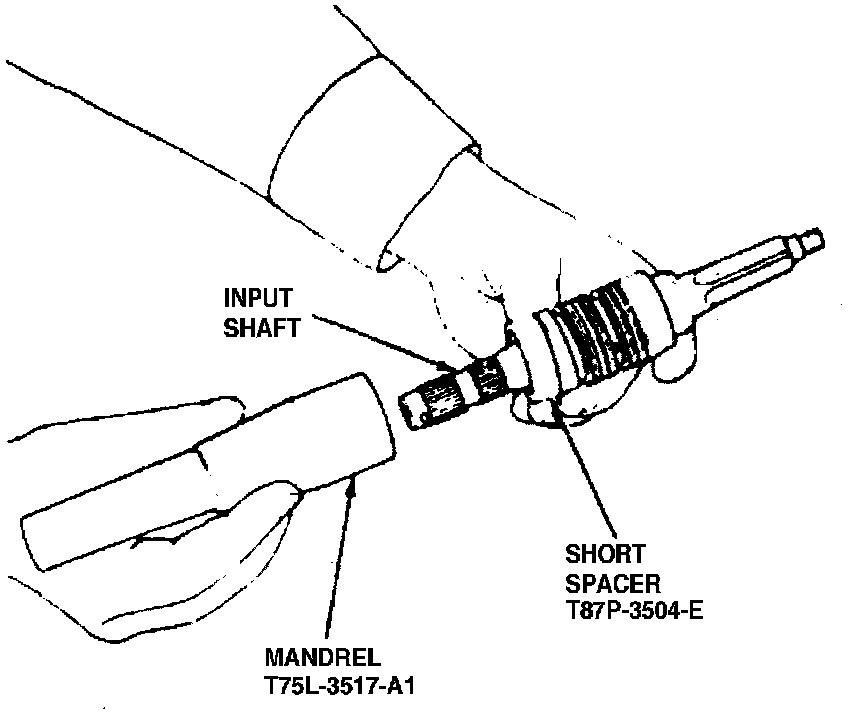 3. Install short spacer over input shaft of valve assembly. Install mandrel part of valve seal installer T75L-3517-A, or equivalent, over shaft and spacer. Mandrel will line up with second groove from input shaft.