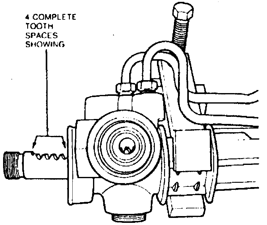 10. Position rack in housing so four complete tooth spaces protrude from lefthand end of housing, then move rack slightly, as necessary, to center tooth visible in valve bore.