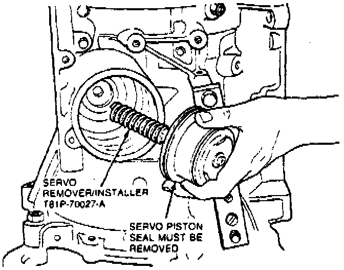 2. Install Servo Replacement Tool No. T81P-70027-A or equivalent on piston rod and position piston in case.