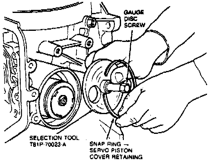 3. Install Servo Piston Selection Tool No. T81P-70023-A or equivalent and secure in case using servo cover snap ring. Tighten gauge disc screw to 13.5 Nm (10 ft lbs).