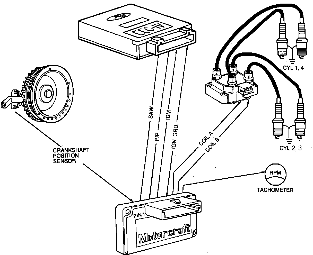 The EI system operates by sending crankshaft position information provided by a Variable Resistance Sensor (VRS), also called Crankshaft Position Sensor (CKP), to the Ignition Control Module (ICM). The ICM generates a Profile Ignition Pickup (PIP) signal and sends it to the Powertrain Control Module (PCM). The PCM responds with a Spark Output (SPOUT) signal containing timing advance or retard information. The ICM processes VRS and SPOUT signals to decide which coil in the 4-tower coil pack to fire. The ICM also produces an Ignition Diagnostic Monitor (IDM) signal to indicate a failure and provide a tachometer signal.