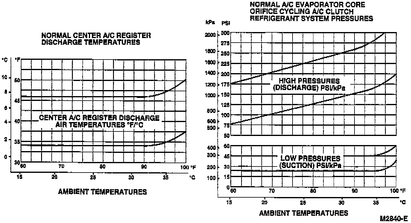 NOTE: When the ambient temperature exceeds 38° C (100° F), the engine should be run at normal idle speed only. For tests in ambient temperatures between 38° C and 43° C (100° F and 110° F ), the system performance pressures will be the same as those for ambient temperatures shown on the chart in the 32° C to 38° C (90° F to 100° F) range. The center A/C register discharge temperatures will also be similar to those shown in the chart in the 32° C to 38° C (90 ° F to 100° F) range.