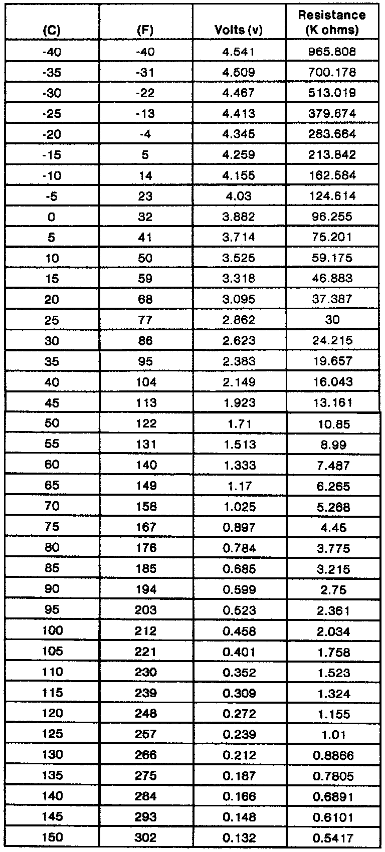 TEMPERATURE/VOLTAGE/RESISTANCE TABLE