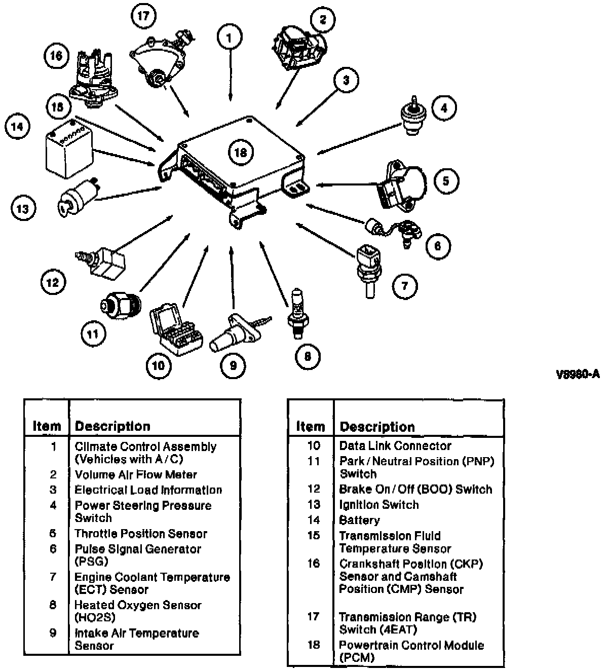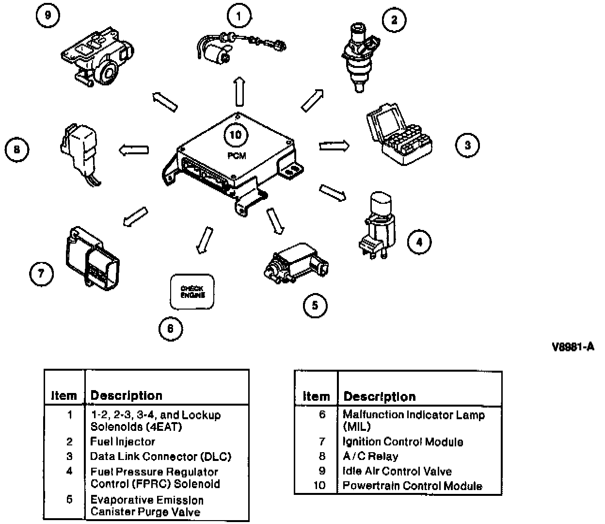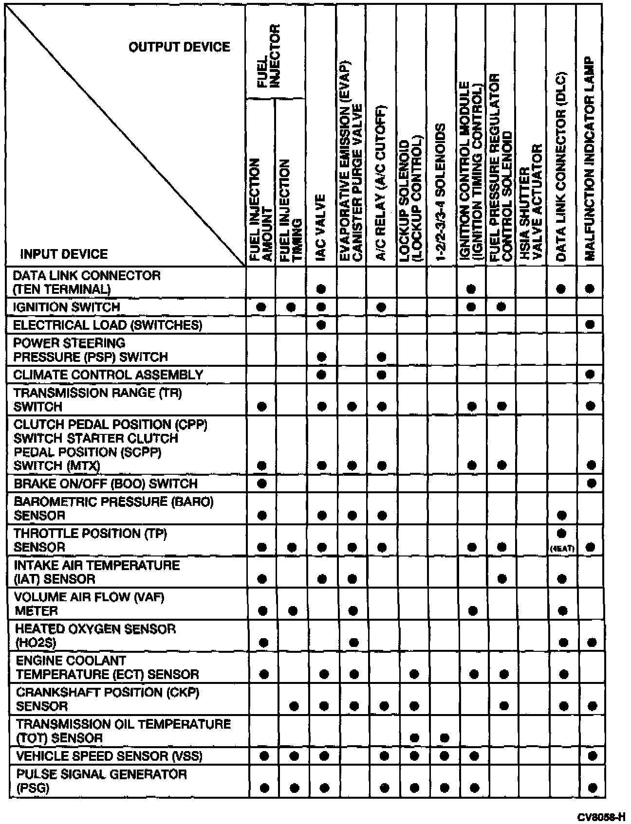 To maintain fuel economy, good driveability, reduced vehicle emissions and during normal operation, the computer monitors various engine sensors and switches. The computer interprets the data in order to control various output devices that effect air intake, amount of fuel injection, fuel injection timing, evaporative emissions, idle-up, deceleration, ignition timing and automatic transaxle lockup operation.
