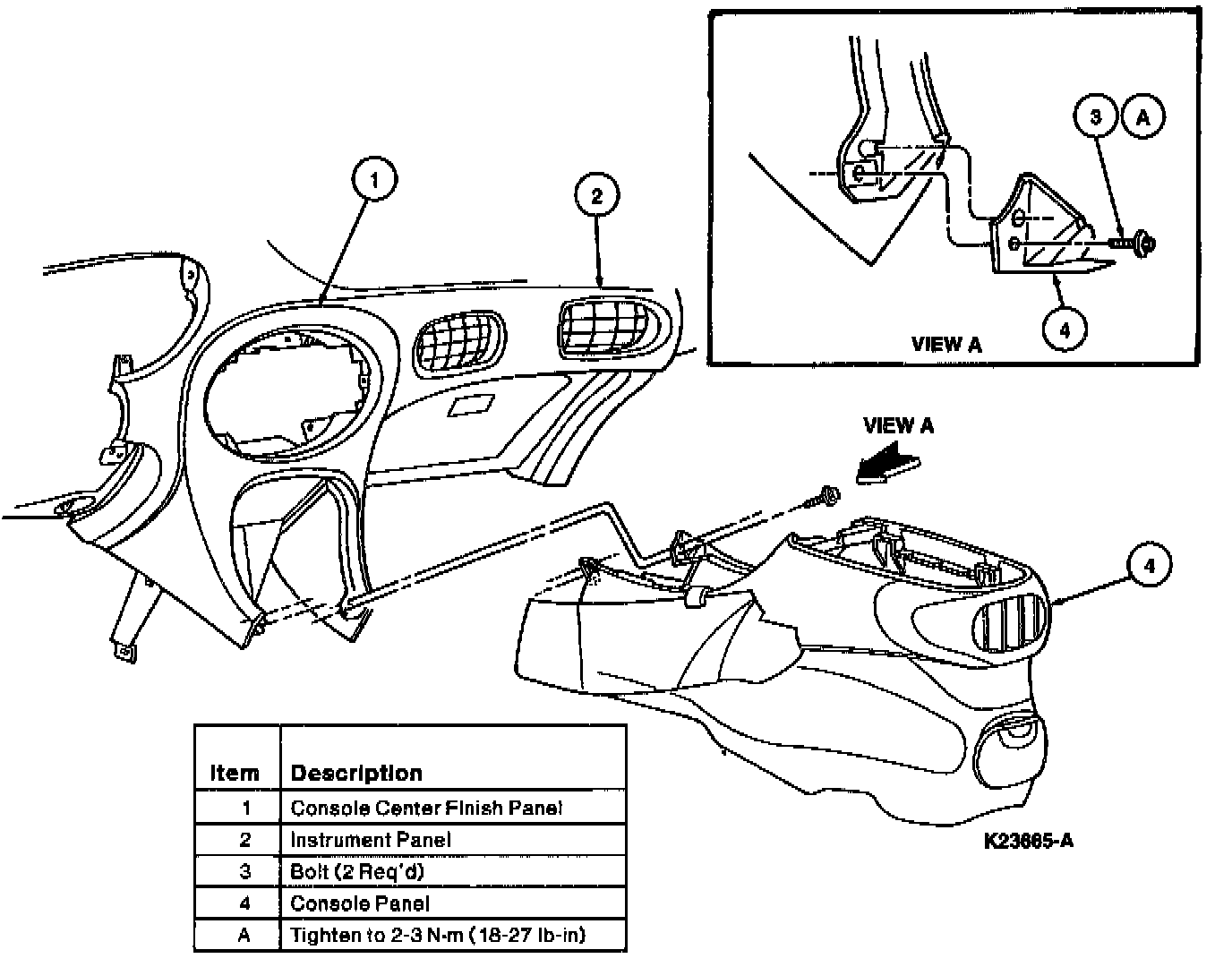 10. To install, reverse removal procedure. lighten two top bolts retaining console panel to front and rear bracket to 9-12 Nm (80-106 lb in). Tighten side mounting bolts to 9-12 Nm (80-106 lb in). Tighten top rear console finish panel retaining screws to 0.9-1.2 Nm (8-11 lb in).