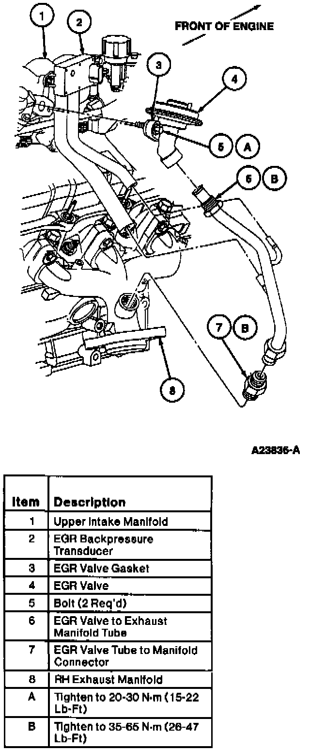6. Tighten EGR valve tube to manifold connector to exhaust manifold to 35-65 Nm (26-48 lb ft).
