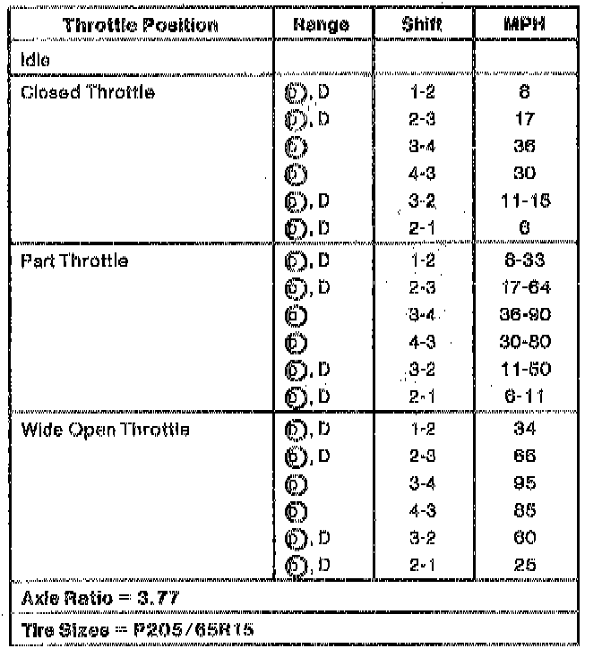 4. Stop vehicle and move transaxle range selector lever to D range. Repeat Step C. Transaxle will make all upshifts except 3-4 and torque converter clutch apply should occur above 46 km/h (27 mph).