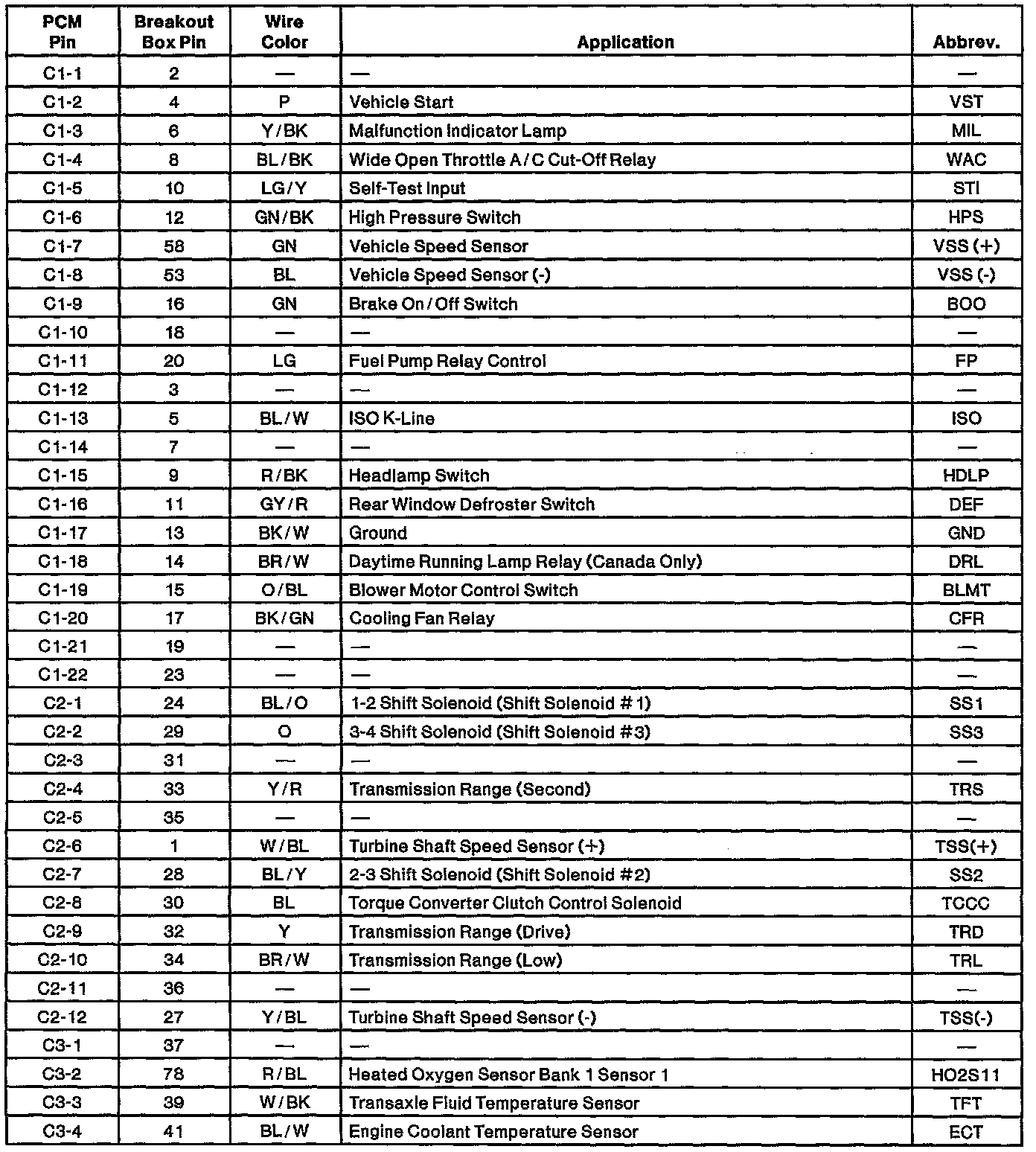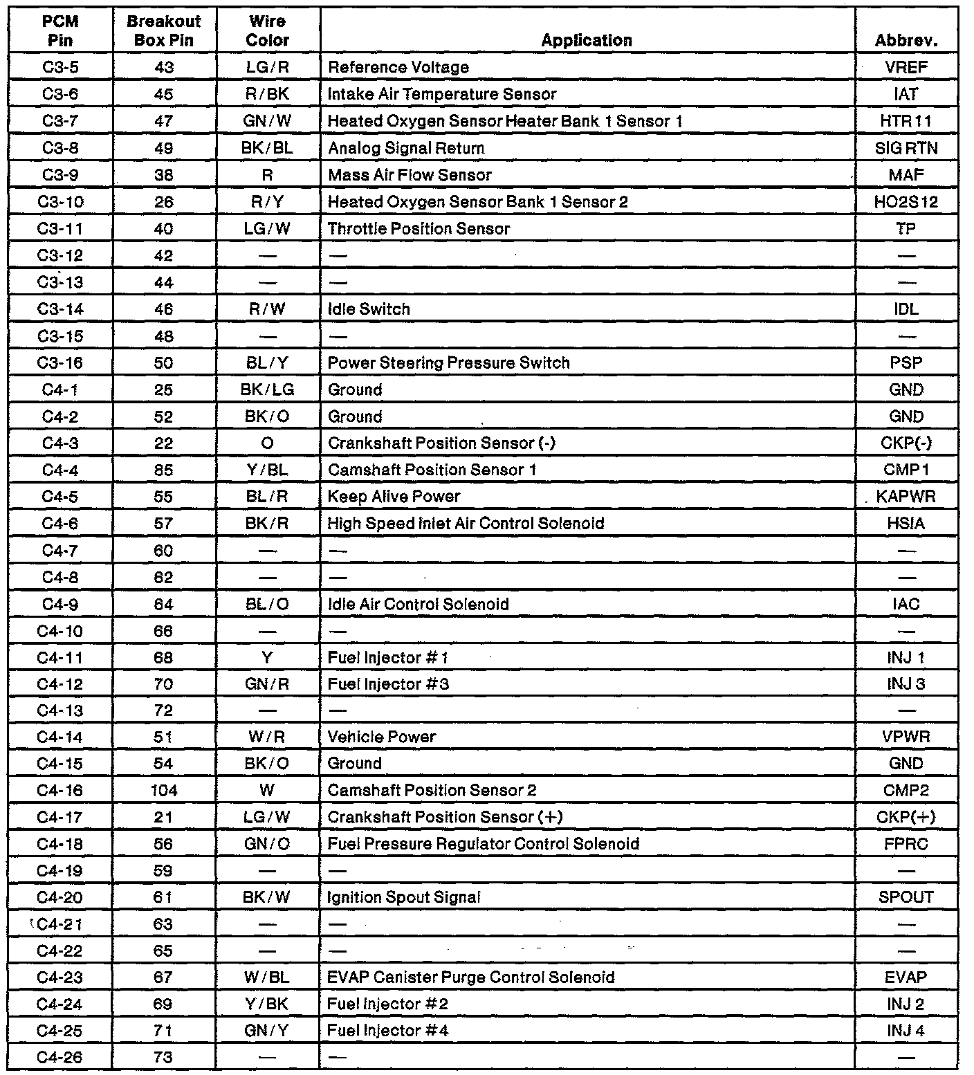 Powertrain Control Module (PCM) Connector Pin Usage: