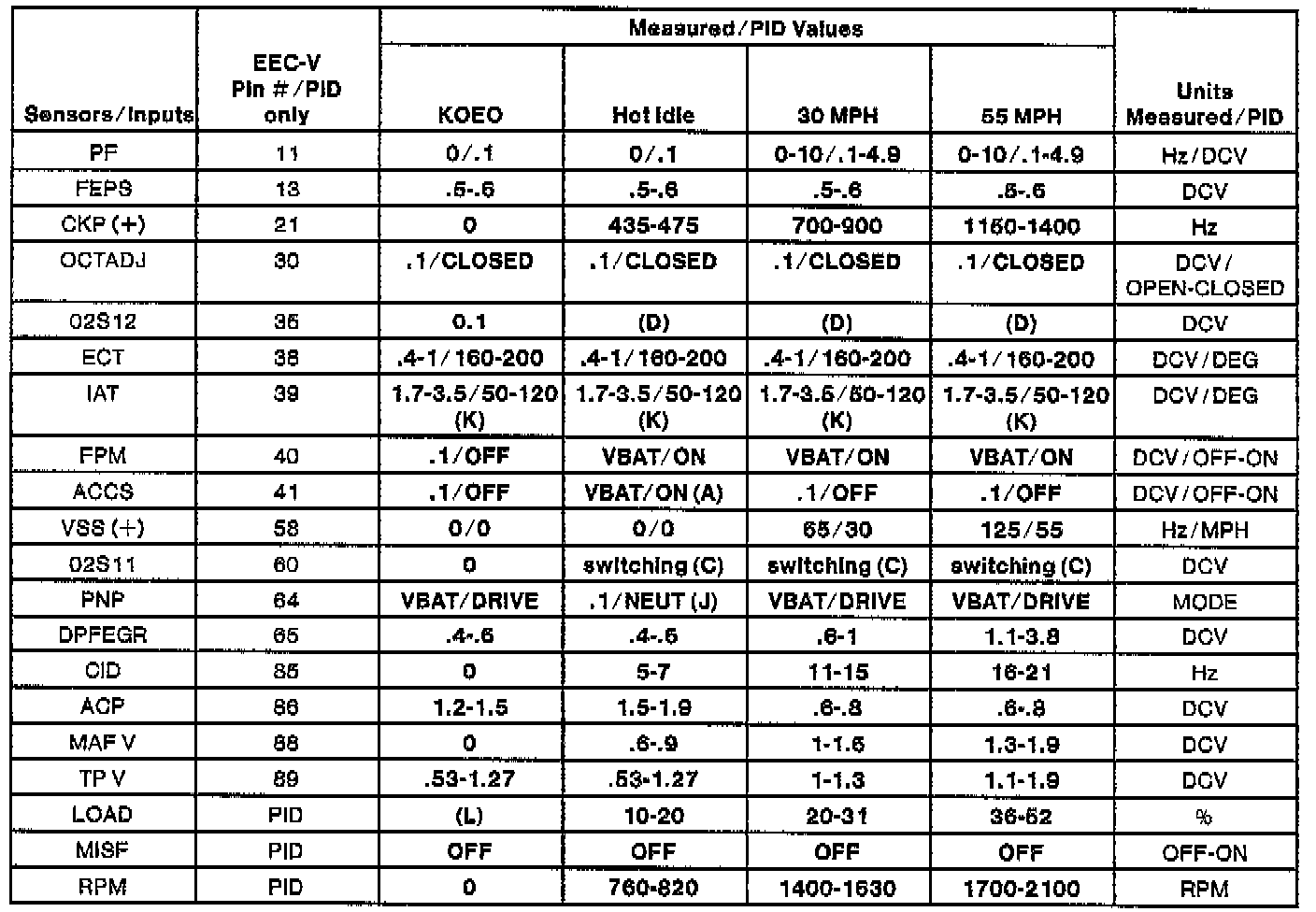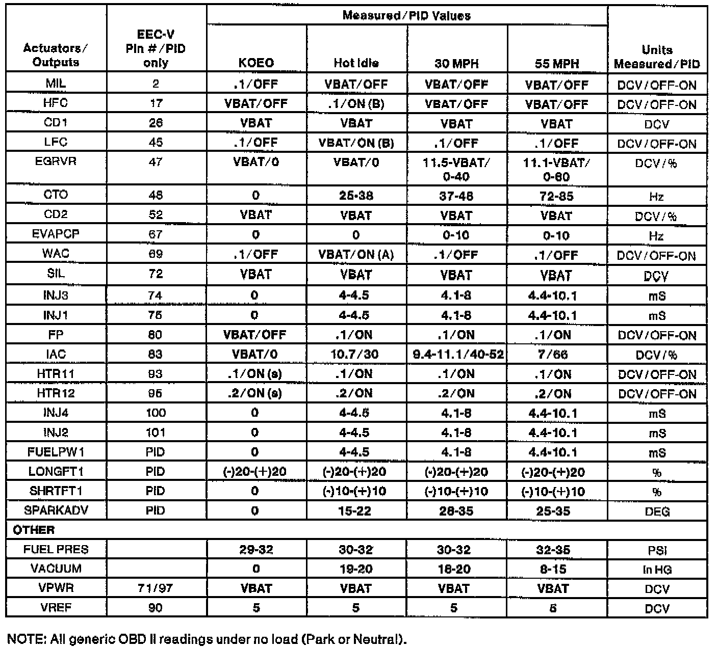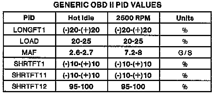 NOTE: All generic OBDII readings under no load (PARK or NEUTRAL).