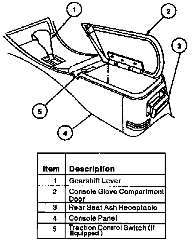The console panel is located between the front seats and consists of the following components: