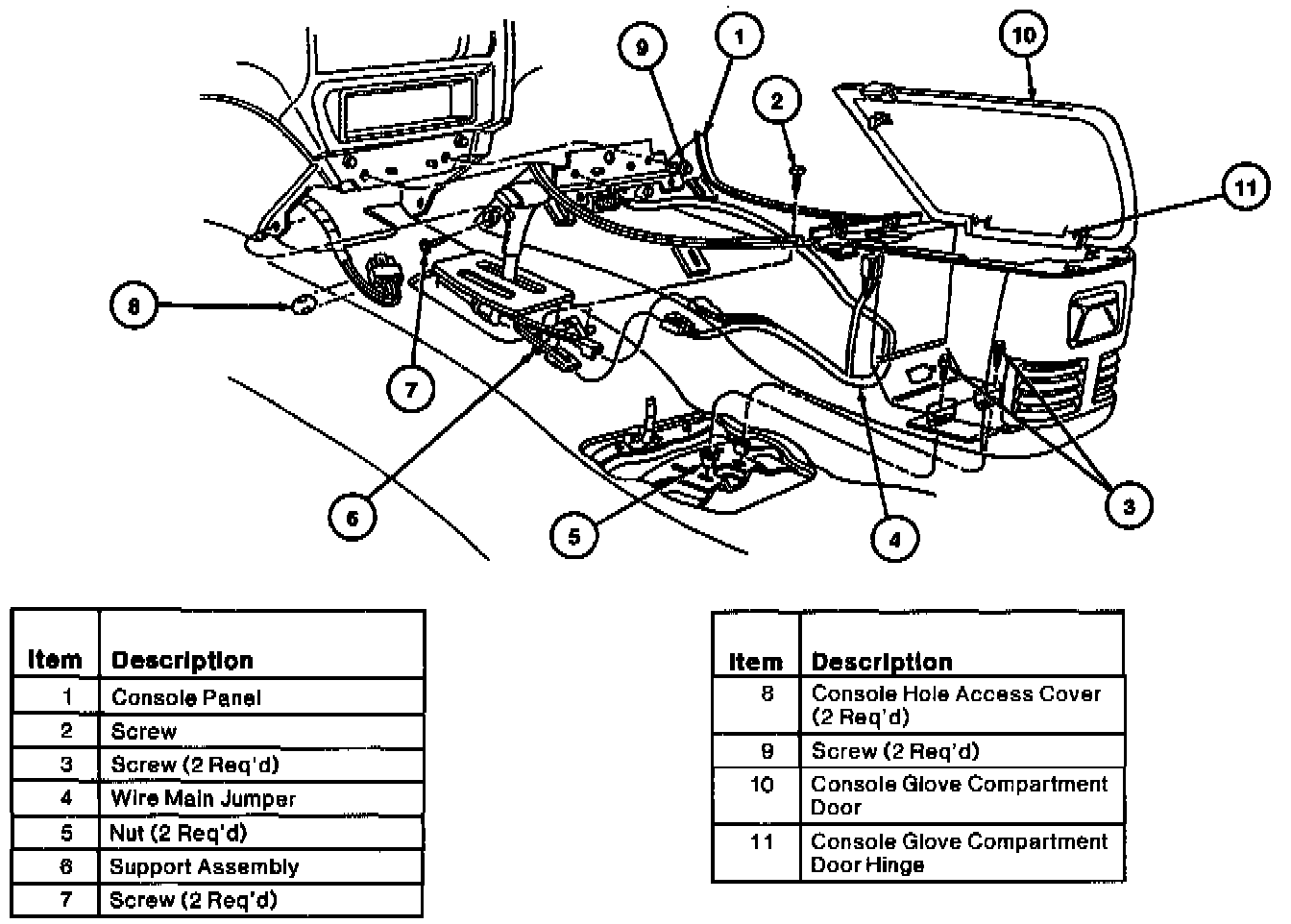 6. Remove two screws from bottom of console glove compartment to front floor pan.