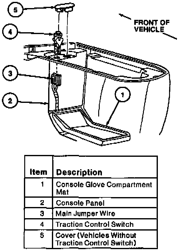5. Remove screws from console glove compartment. Disconnect traction control switch (if equipped).