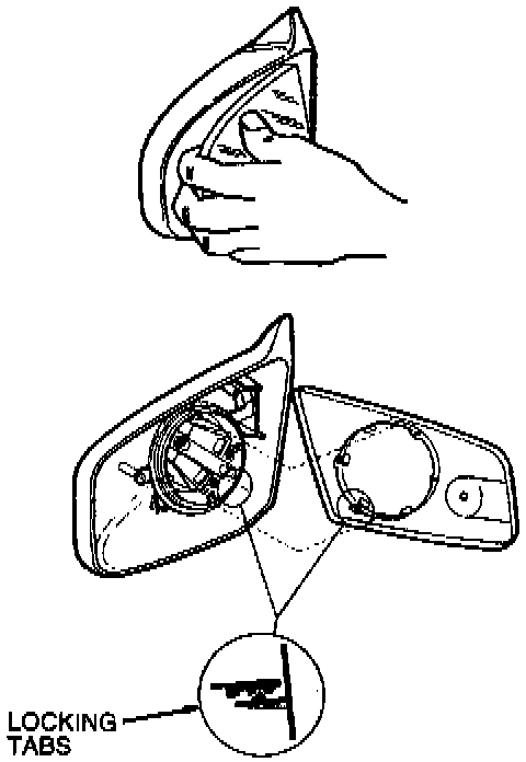 1. Line up locking tabs of outside rear view mirror glass to the outside rear view mirror.
