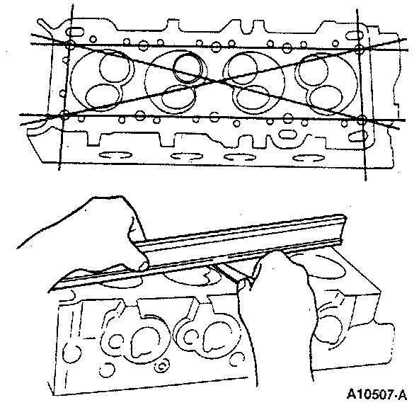 When a cylinder head is removed because of gasket leaks, check the flatness of the head gasket surface to make sure it conforms to specification using Straight Edge D83L-4201-A or equivalent and feeler gauge.