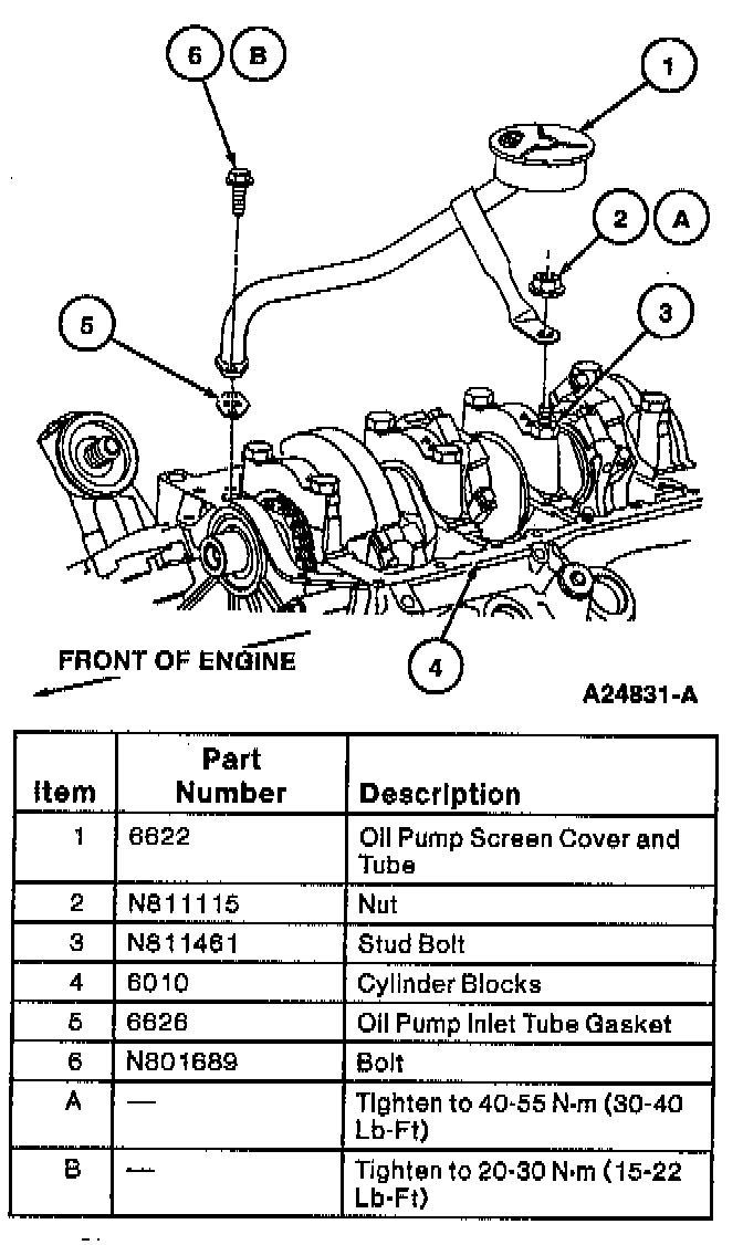 1. Install oil pump screen cover and tube using a new oil pump inlet tube gasket. Tighten retainer bolts to 20-30 Nm (15-22 ft. lbs.) and support bracket nut to 40-55 Nm (30-40 ft. lbs.).