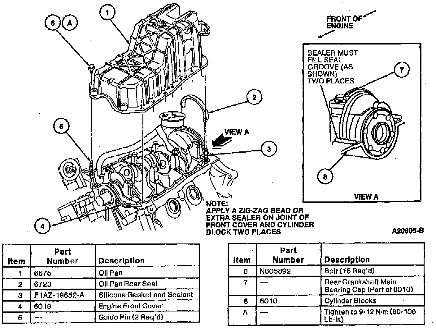 4. Apply Silicone Gasket and Sealant F6AZ-19562-AA or equivalent meeting Ford specification WSE-M4G323-A6 to oil pan.