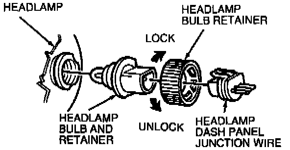 NOTE: A correctly aimed headlamp normally need not be re-aimed after installation of this headlamp bulb and retainer. A burned out headlamp bulb should not be removed from the headlamp until just before a replacement headlamp bulb and retainer is to be installed. Removal of a headlamp bulb for an extended period of time may allow contaminants (dust, moisture, smoke) to enter the headlamp and affect the performance of the headlamp. When servicing the headlamp bulb and retainer, energize the headlamp bulb only while it is contained within the headlamp body.